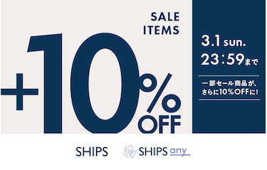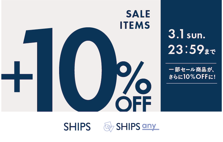日頃よりSHIPSグループをご利用いただき、誠にありがとうございます。 3月1日(日)23:59まで、アウトレット品対象のタイムセールを開催いたします。 期間限定で対象商品がお求めやすくなります。 この機会をお見逃しなく! ■開催日:2026年2月11日(水)0:00~3月1日(日)23:59 ※掲載商品は一部になります。